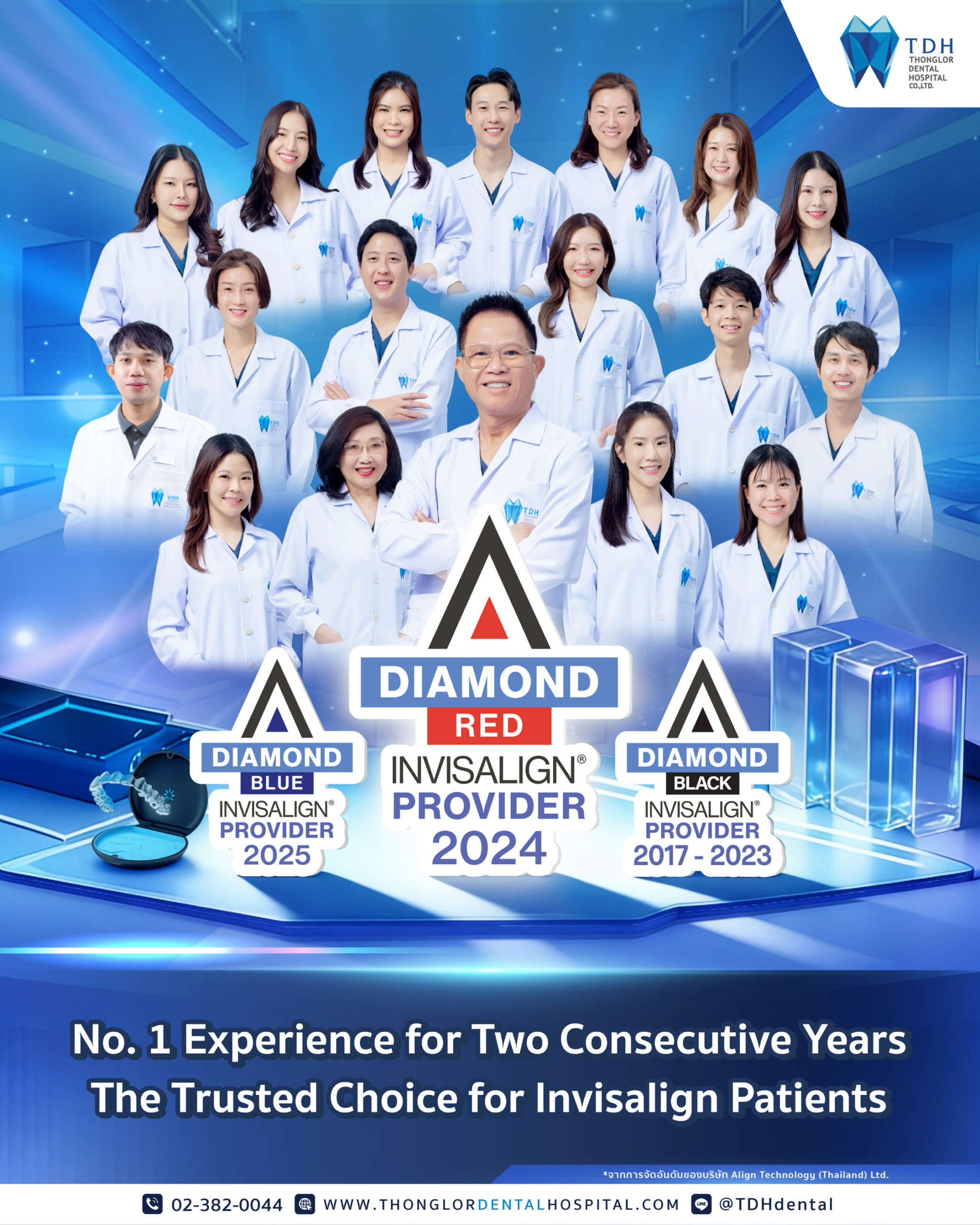 In 2024, TDH was awarded Thailand’s only Invisalign® Red Diamond Provider status – the highest tier level awarded to an Invisalign provider. This achievement is a strong indicator of TDH Dental’s wealth of clinical experience when it comes to aligner orthodontics. An Invisalign® Red Diamond Provider is vouched by patients from no less than 1,000 successfully/year treated cases annually. These cases range from moderate to highly complex cases a top provider like TDH Dental can treat masterfully and efficiently.