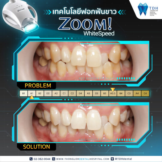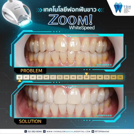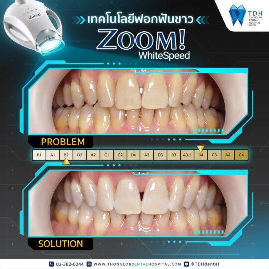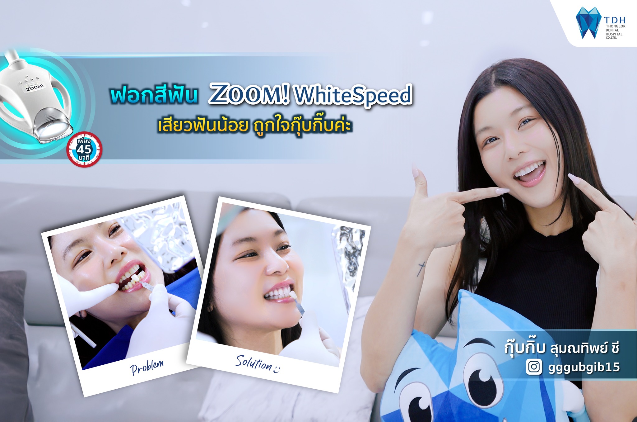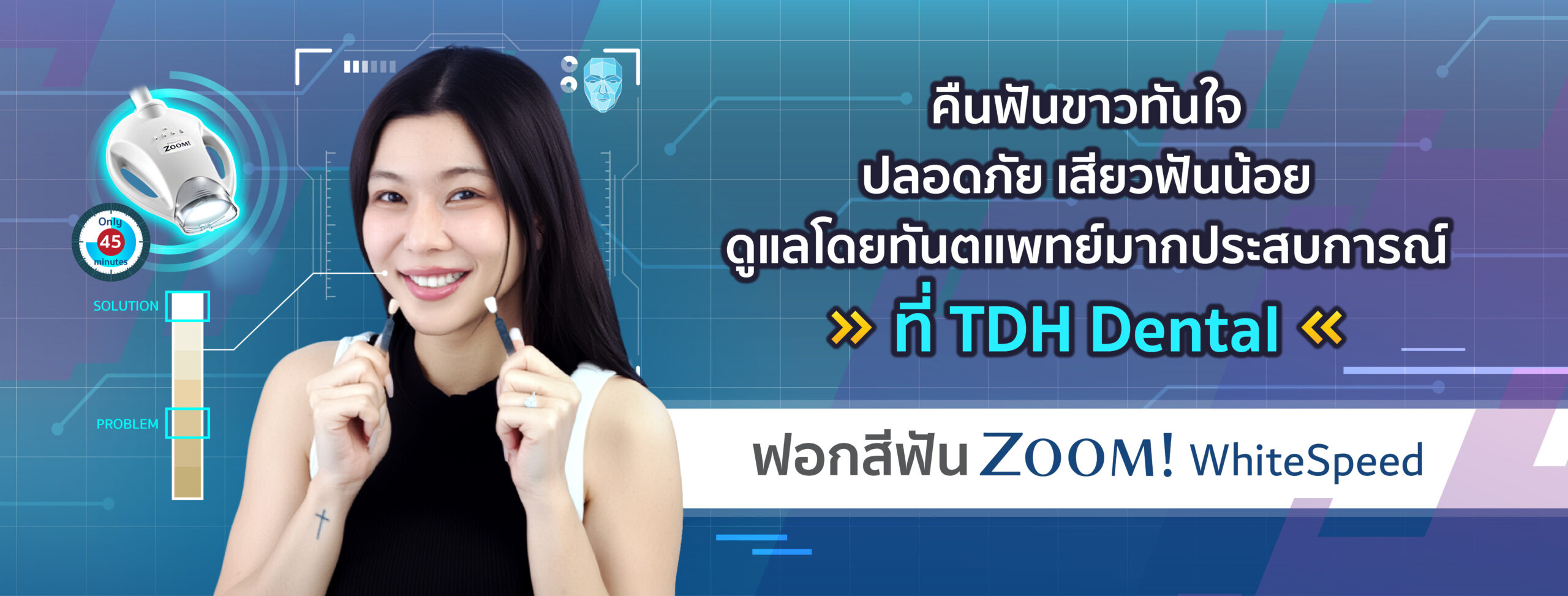 การฟอกสีฟัน Zoom White Speed เป็นระบบการฟอกสีฟันที่กระตุ้นด้วยแสงที่ปลอดภัย ทำให้ฟันขาวอย่างมีประสิทธิภาพ สะอาด รวดเร็ว เจลฟอกสีฟันของ ZOOM! ที่ถูกพัฒนาขึ้นโดยบริษัท Phillips USA และบริษัทวิจัยชั้นนำ เป็นเทคโนโลยีที่มีประสิทธิภาพสูงจากอเมริกา ที่ออกแบบให้เจลออกฤทธิ์ได้อย่างอ่อนโยน ด้วยการที่เจลฟอกสีฟันจะค่อย ๆ แทรกซึมลงสู่ชั้นผิวฟัน ในเจลฟอกสีฟันของ ZOOM! จะมีสาร Hydrogen Peroxide แตกตัว Hydrogen จะเข้าสู่ชั้นผิวโดยจะไม่ทำลายโครงสร้างของฟันธรรมชาติ ดังนั้นที่ TDH Dental จึงเลือก เทคนิคการฟอกสีฟันด้วยระบบ ZOOM!