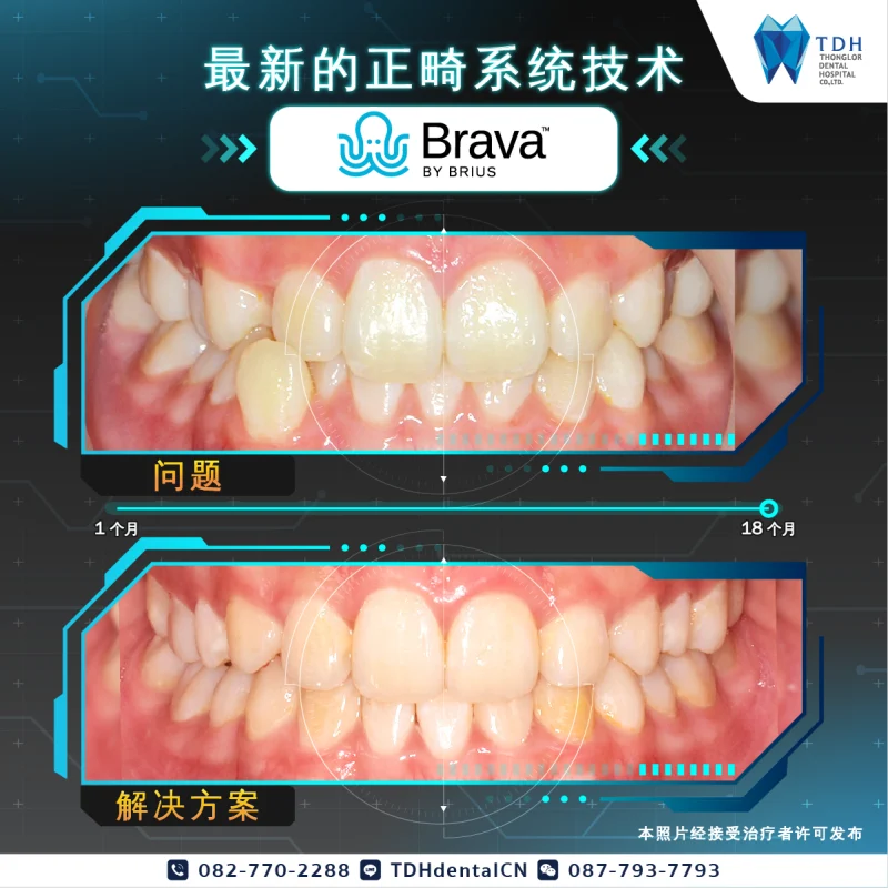 Brava by Brius 是目前牙齿矫正领域的最新技术,该系统运用人工智能技术实现高效精准的牙齿移动,可显著缩短矫正周期。临床数据显示,其矫正效率比其他传统系统提升约55%。TDH牙科是泰国首批引进并开展该技术的专业医疗机构之一。