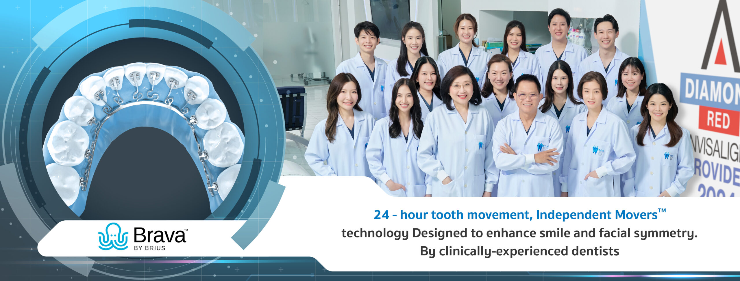Brava by Brius 是牙齿矫正领域的最新技术,它使用贴在牙齿内侧的金属,使它变得隐形。Brava by Brius 采用人工智能技术分析和处理数据,使牙齿移动更柔和,治疗速度提高 55%