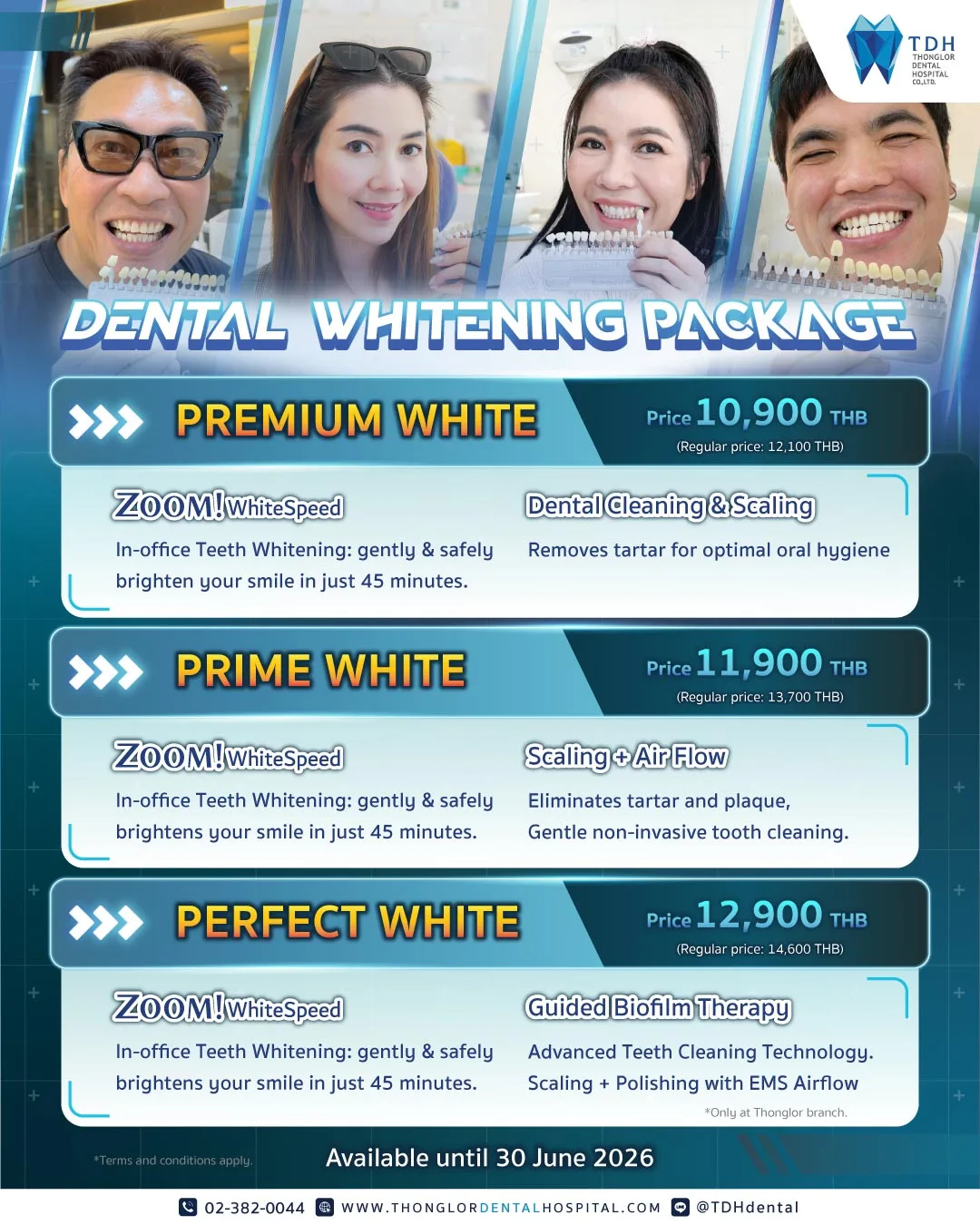 • Confident white smile: Choose a Premium White package (scaling + Airflow + teeth whitening) 11,900 baht