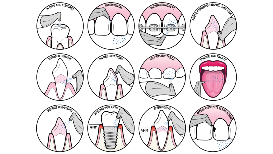 AIRFLOW® เป็นเทคโนโลยีการทำความสะอาดฟันที่ใช้แรงดันน้ำ ลม และผง Erythritol ขนาดเล็กเพื่อกำจัด:
