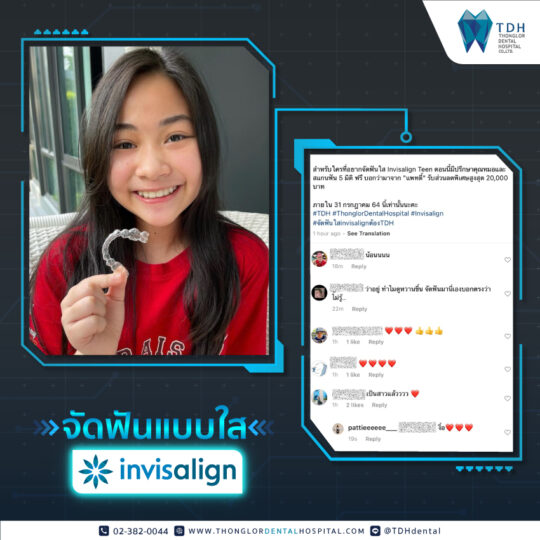 หนูจัด Invisalign มาตั้งแต่หนูอายุ 8 ขวบ ตอนนี้หนูมีความมั่นใจในรอยยิ้มของตัวเองมากๆเลยค่ะ แนะนำเพื่อนๆมาปรึกษาจัดฟันที่ TDH Dental นะค่ะ