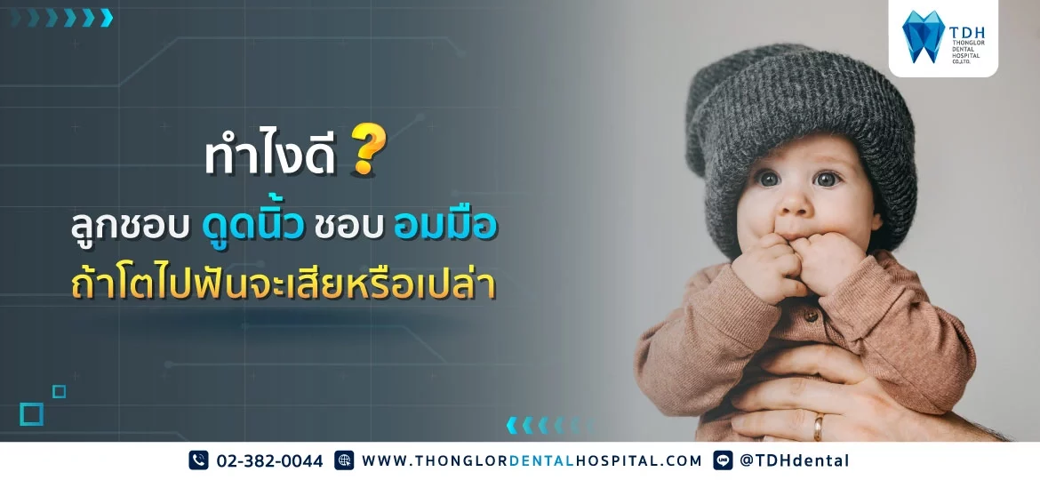 พฤติกรรมการดูดนิ้วในเด็กจะส่งผลต่อการขึ้นของฟัน ทำให้ฟันขึ้นในตำแหน่งที่ผิดปกติได้ เนื่องจากนิ้วหัวแม่มือไปดันฟันไว้ ทำให้เกิดความผิดปกติของกระดูกใบหน้าขากรรไกรได้ สำหรับคุณพ่อคุณแม่ท่านใดที่ต้องการคำปรึกษาเรื่องการดูดนิ้วในเด็กที่อาจส่งผลต่อฟันได้ สามารถเข้ามาขอคำแนะนำจากหมอฟันเด็กที่ ศูนย์ทันตกรรมเด็ก TDH Dental สาขาปุณณวิถี ได้