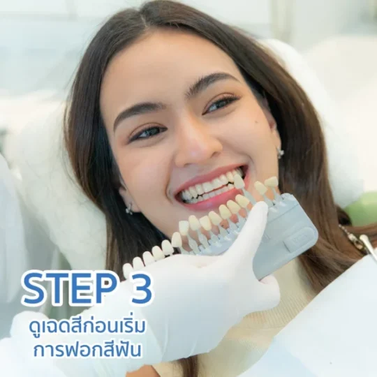 ขั้นตอนที่ 3 ก่อนเริ่มกระบวนการฟอกสีฟัน ทันตแพทย์จะให้ดูเฉดสีฟันว่าปัจจุบันอยู่ในเฉดสีไหน และจะมีการพูดคุยกับผู้เข้ารับการรักษาว่าต้องการฟันที่ขาวระดับไหน